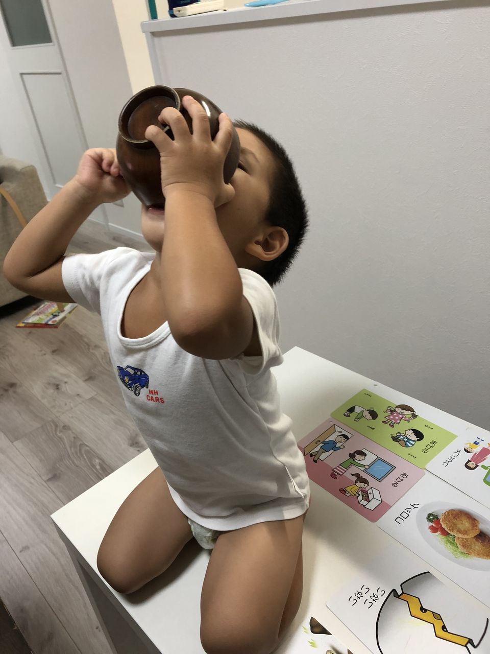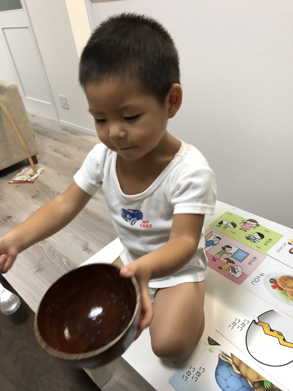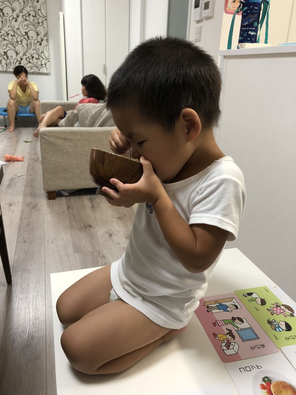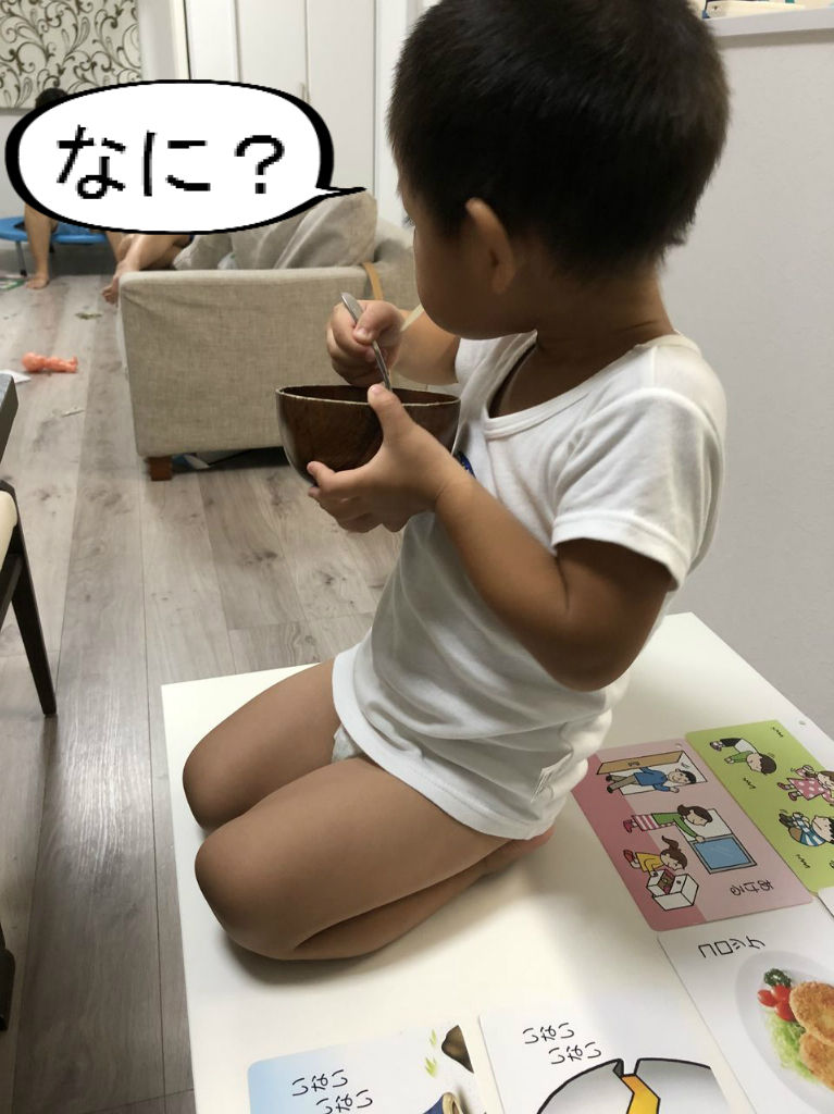 それ、イスで食べる食卓やのに、わざわざ低い机の上に