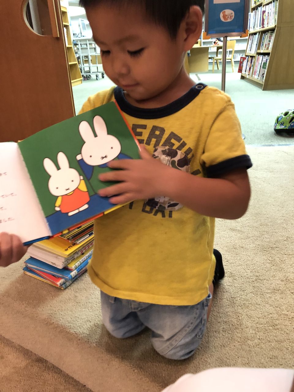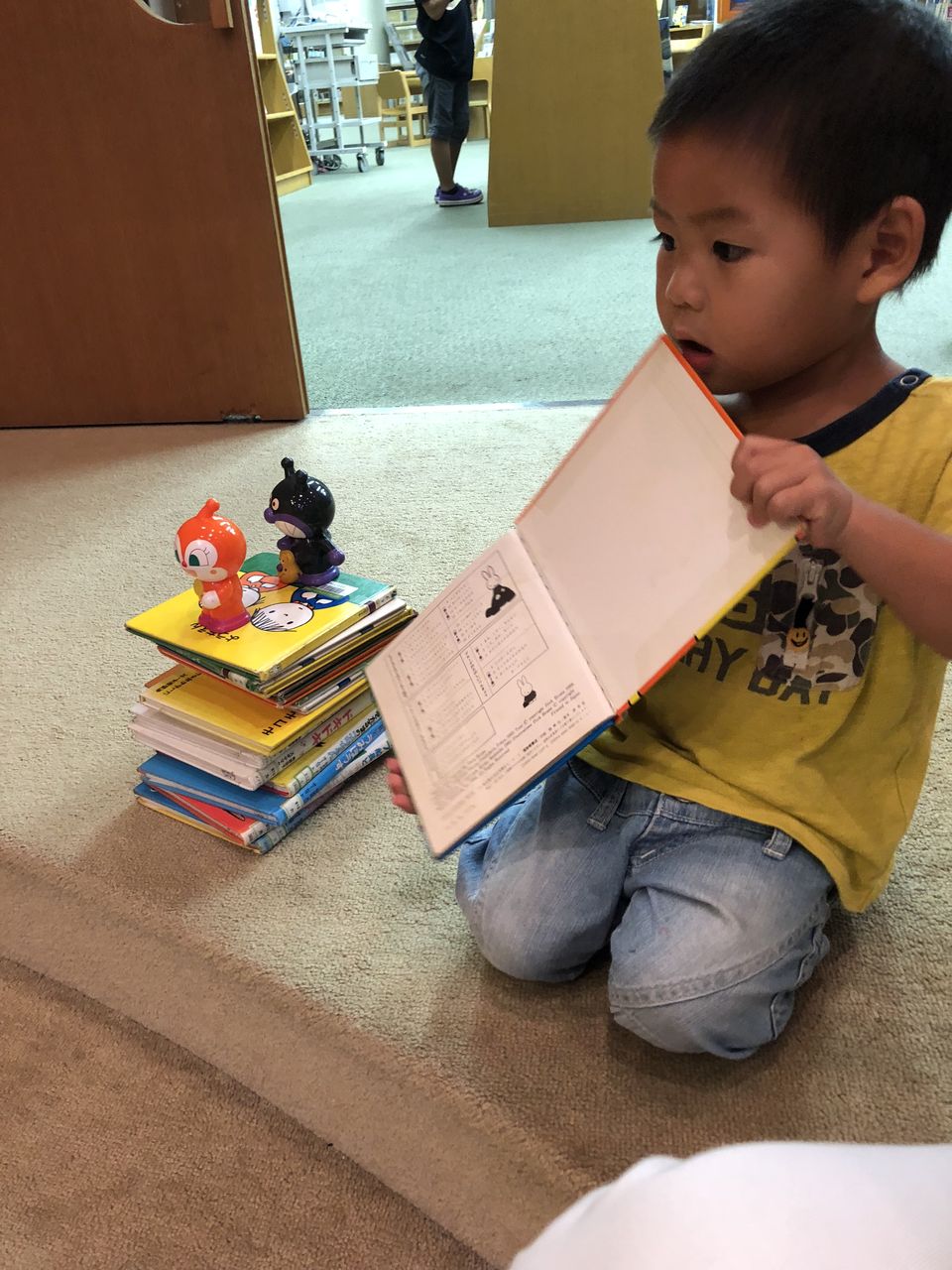 図書館に着いたら早速、大量の絵本たちを前に、超大興奮で集めだして