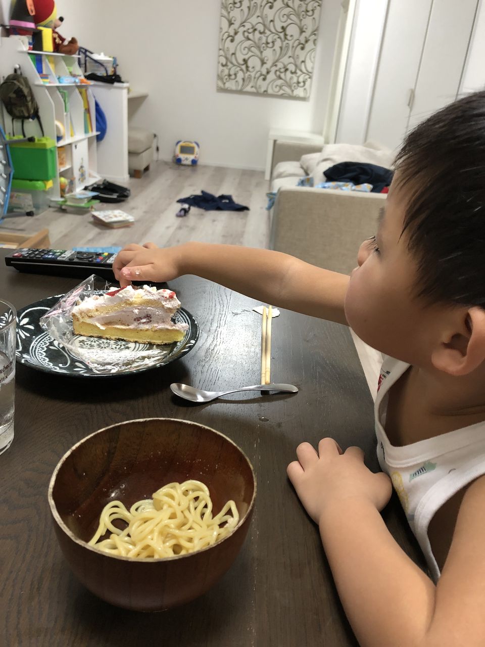 ラーメンの汁だけ飲んで、遊んでる間に麺が乾いてきたところで、ケーキをあげてみた