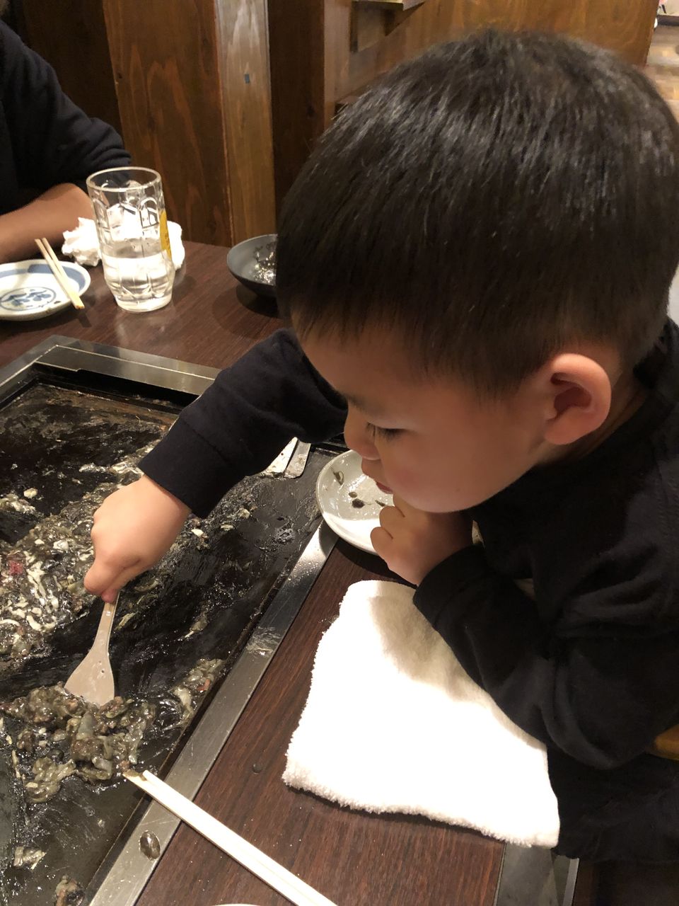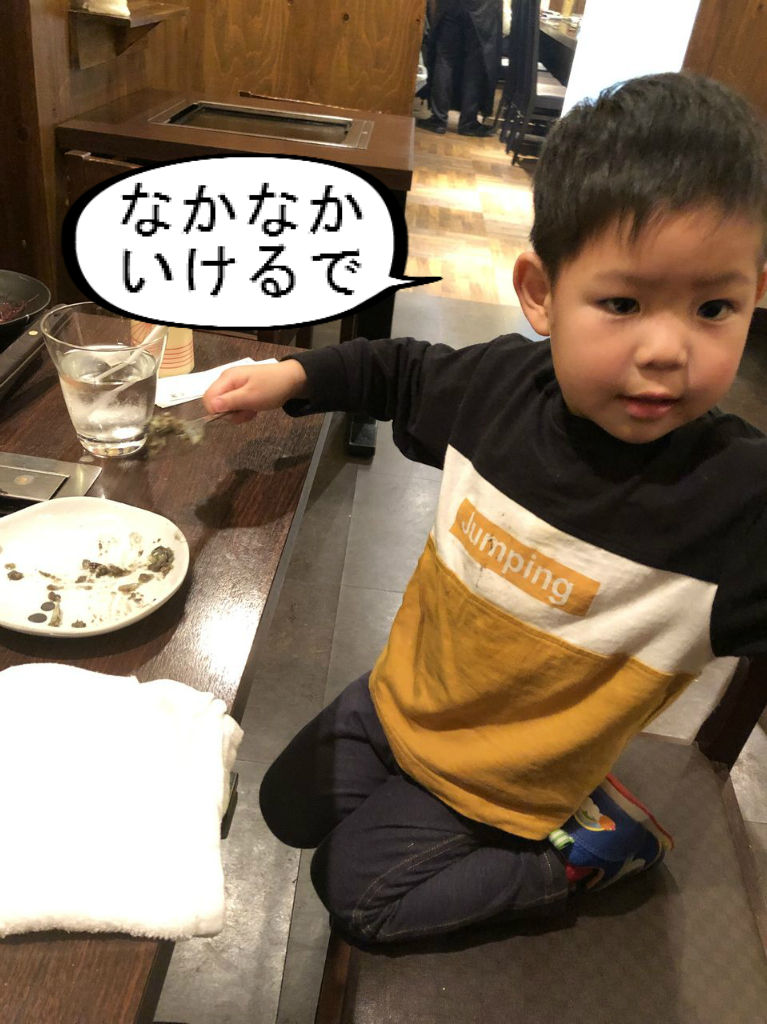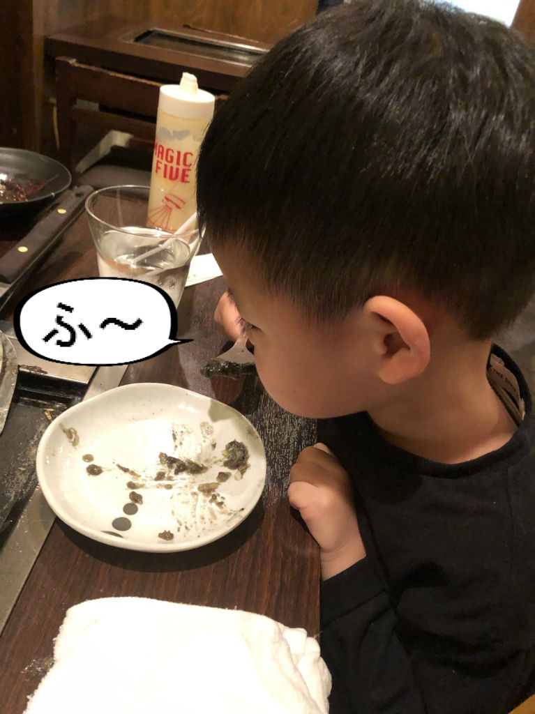 鉄板焼きって、参加型やからはっちゃんも喜ぶけど、ヘラですくいながら鉄板に手付いて火傷しそうで見ててチョー心配