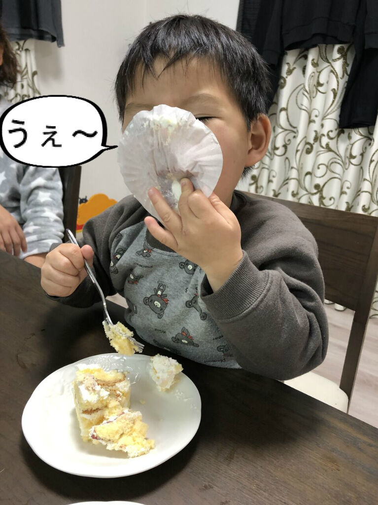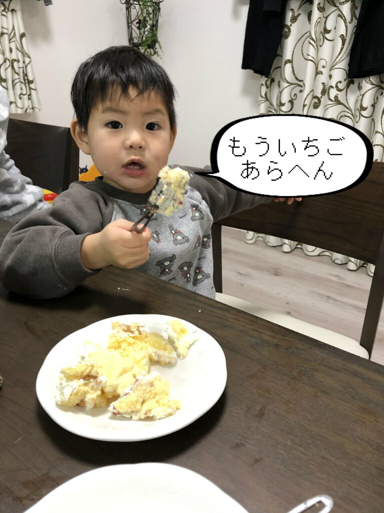結局、スポンジの間に挟まってたイチゴも全部ほじくって、ケーキの全景は無残な姿に
