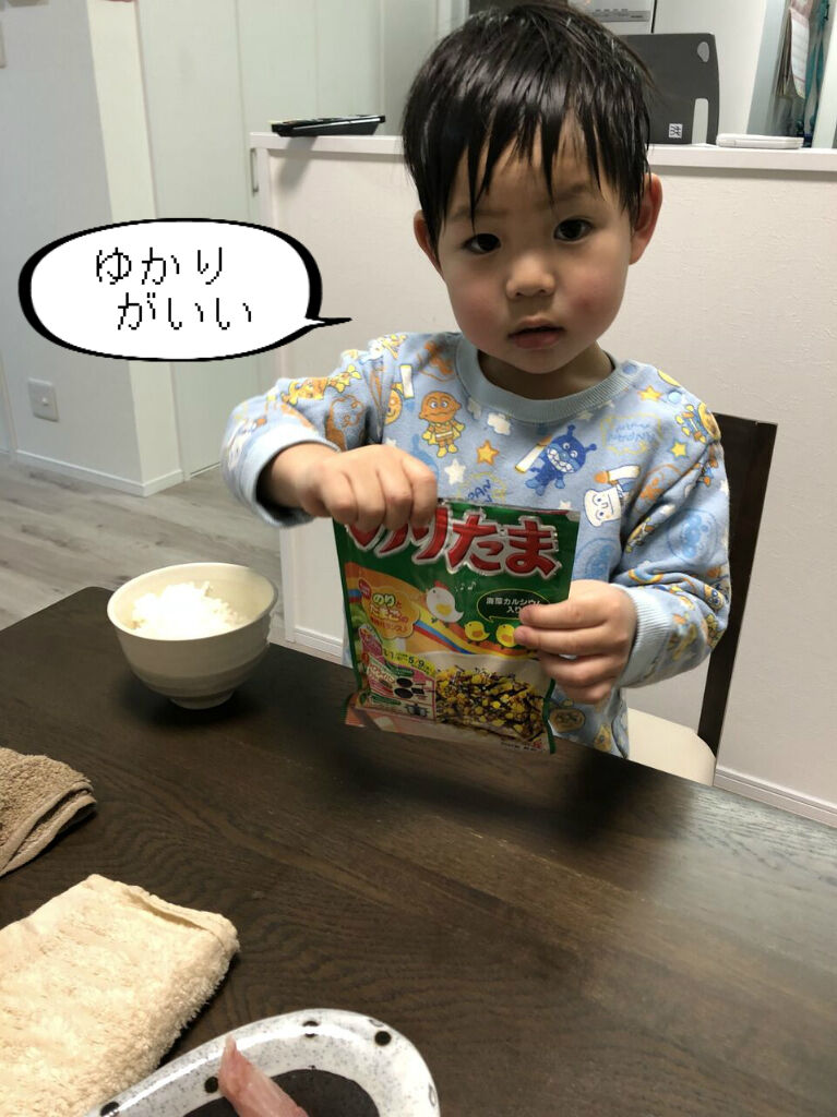 スーパー行ったときは、アンパンマンのふりかけを欲しがるくせに、中に入っているシールを取るのが目的で、ごはんにかけるのはいつも「ゆかり」