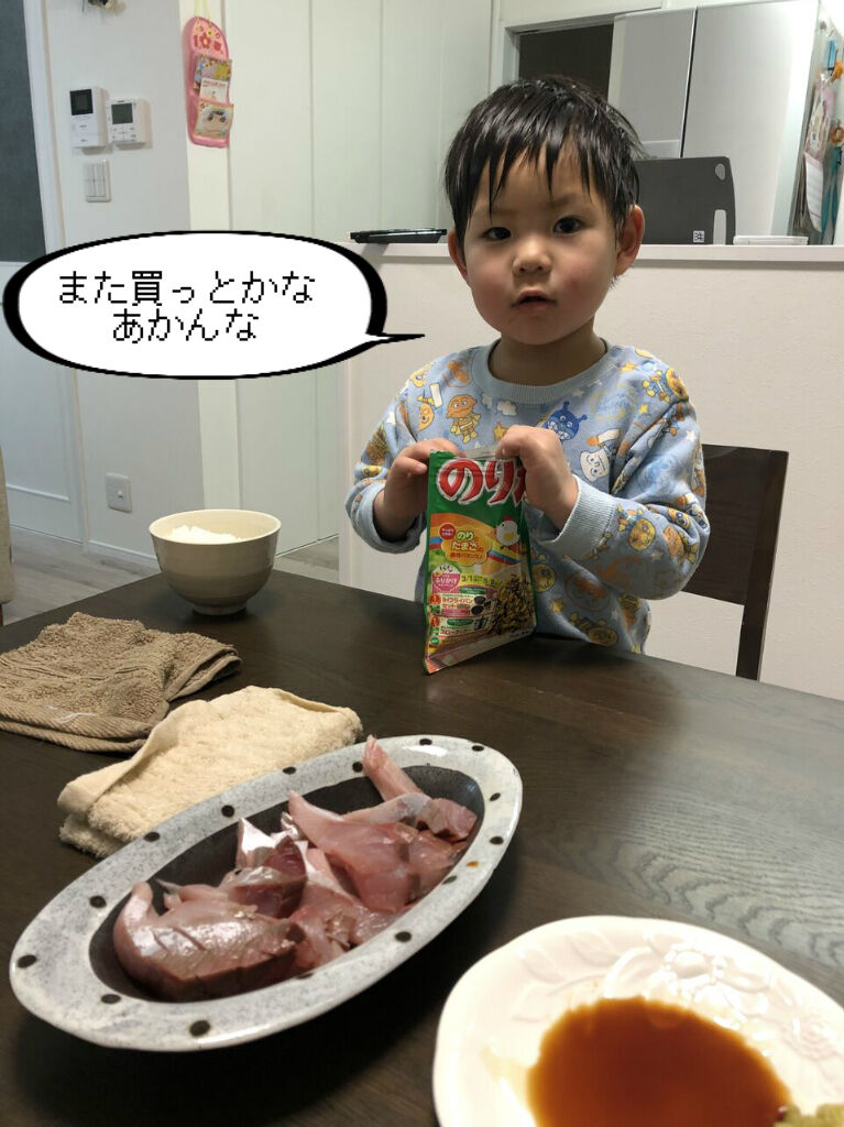 相変わらず、ふりかけご飯におかずはハマチというオリジナルの食べ合わせを楽しむ、はっちゃん