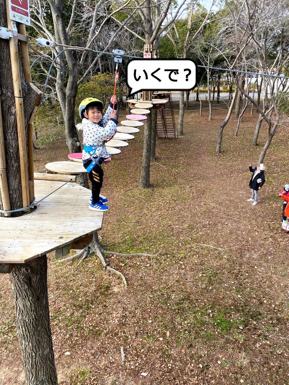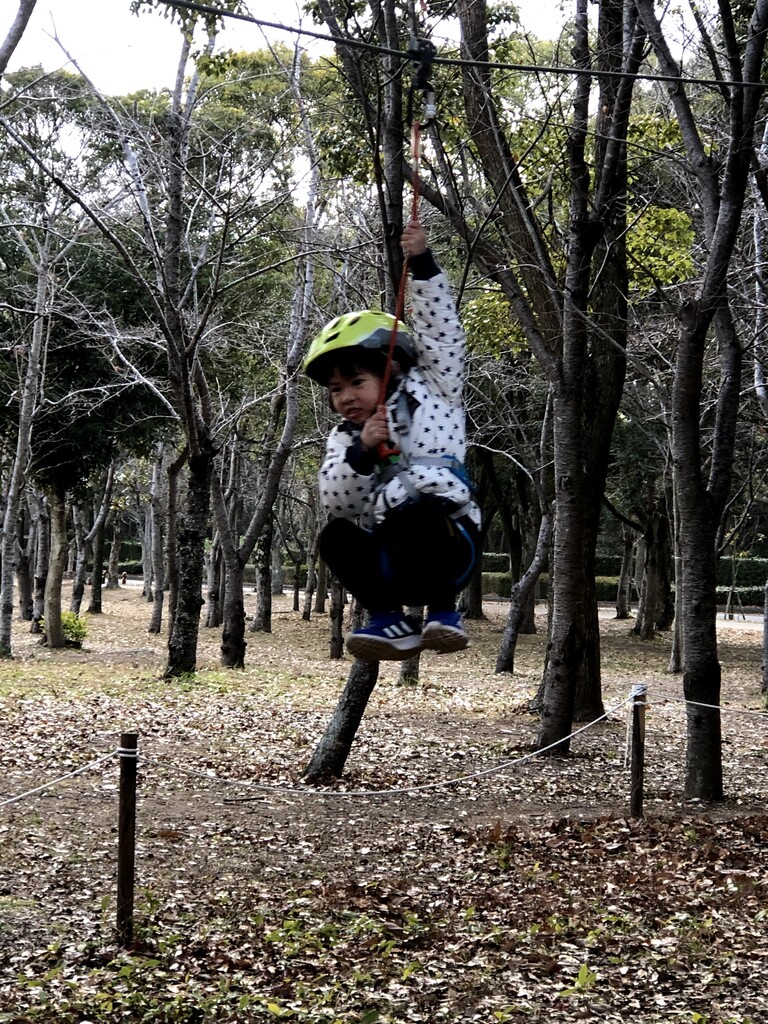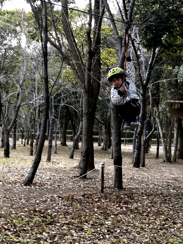 ジップラインがあるアスレチックに来た、はっちゃん